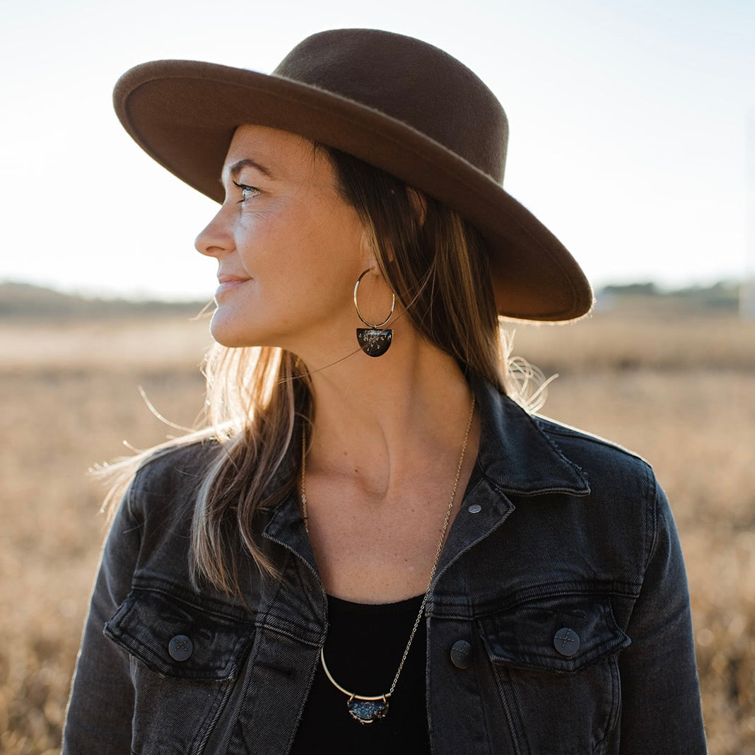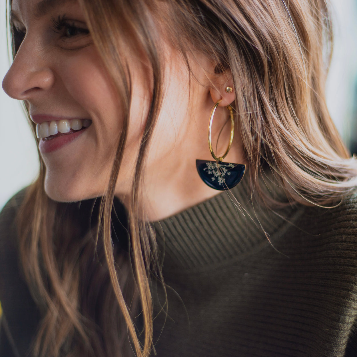 Hoops are gold filled. Half circle pendants are brass. All pieces are lead and nickel free.