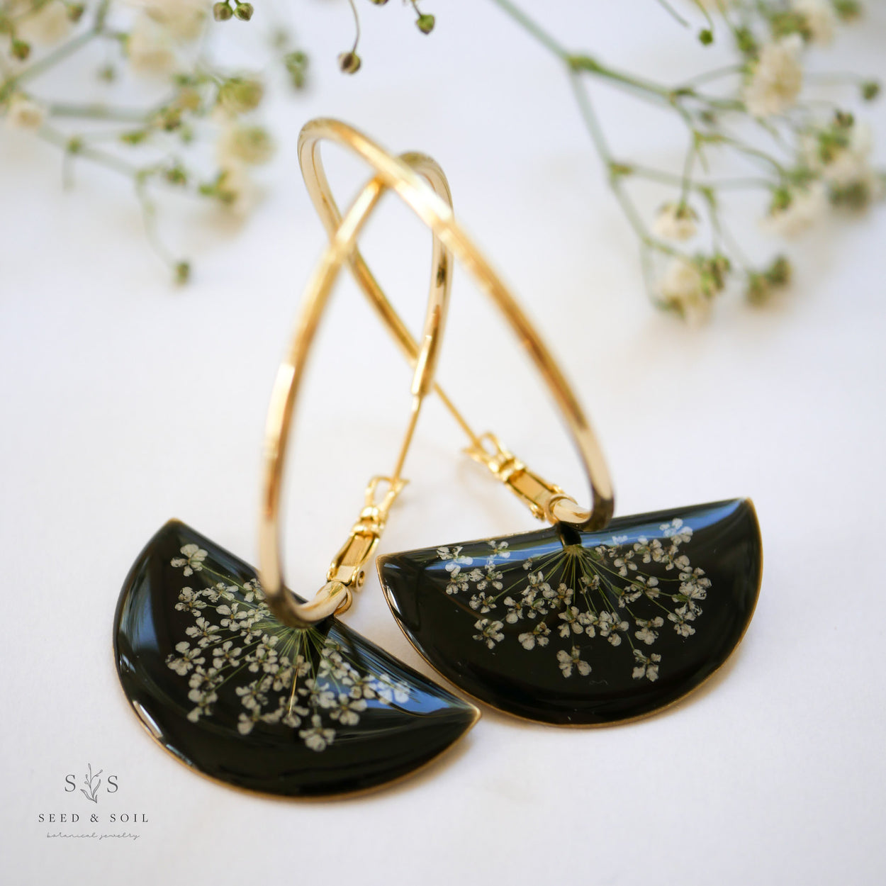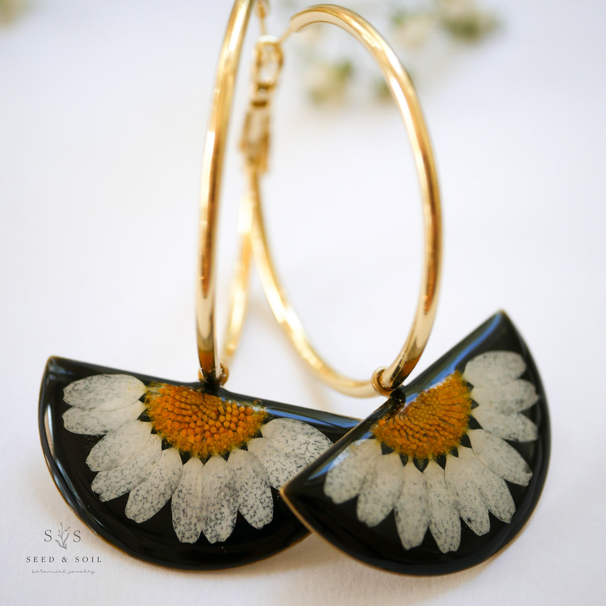 A real flower is preserved in each brass half circle pendant. Pendant hangs from a 40mm hoop (approx 1 1/2")
