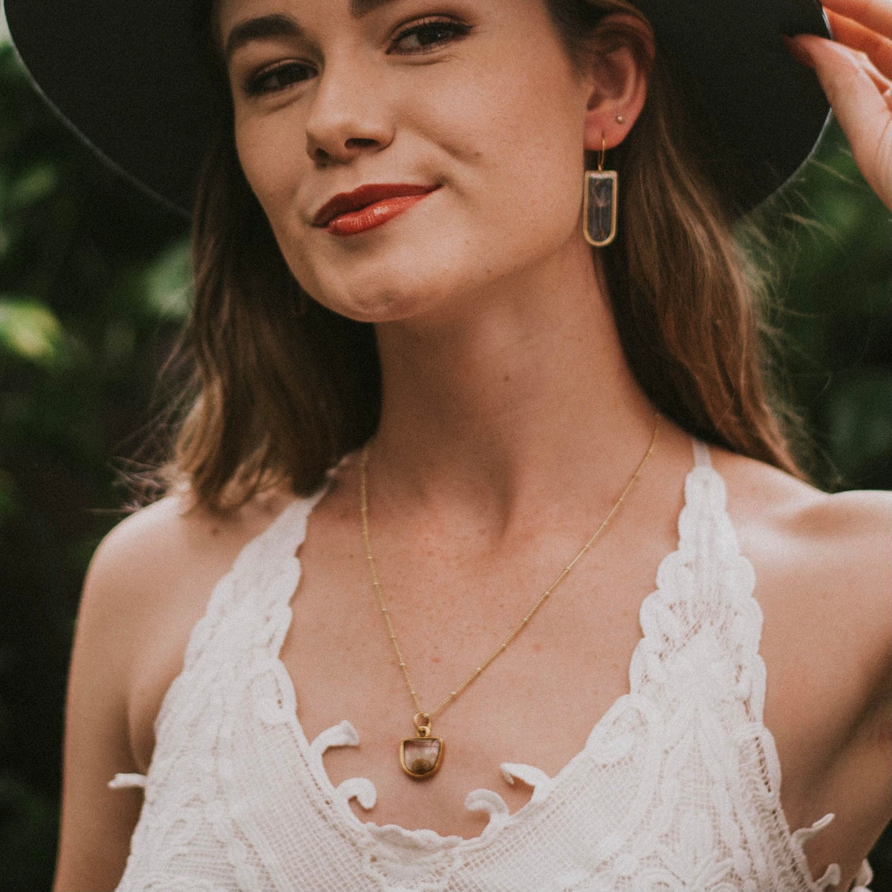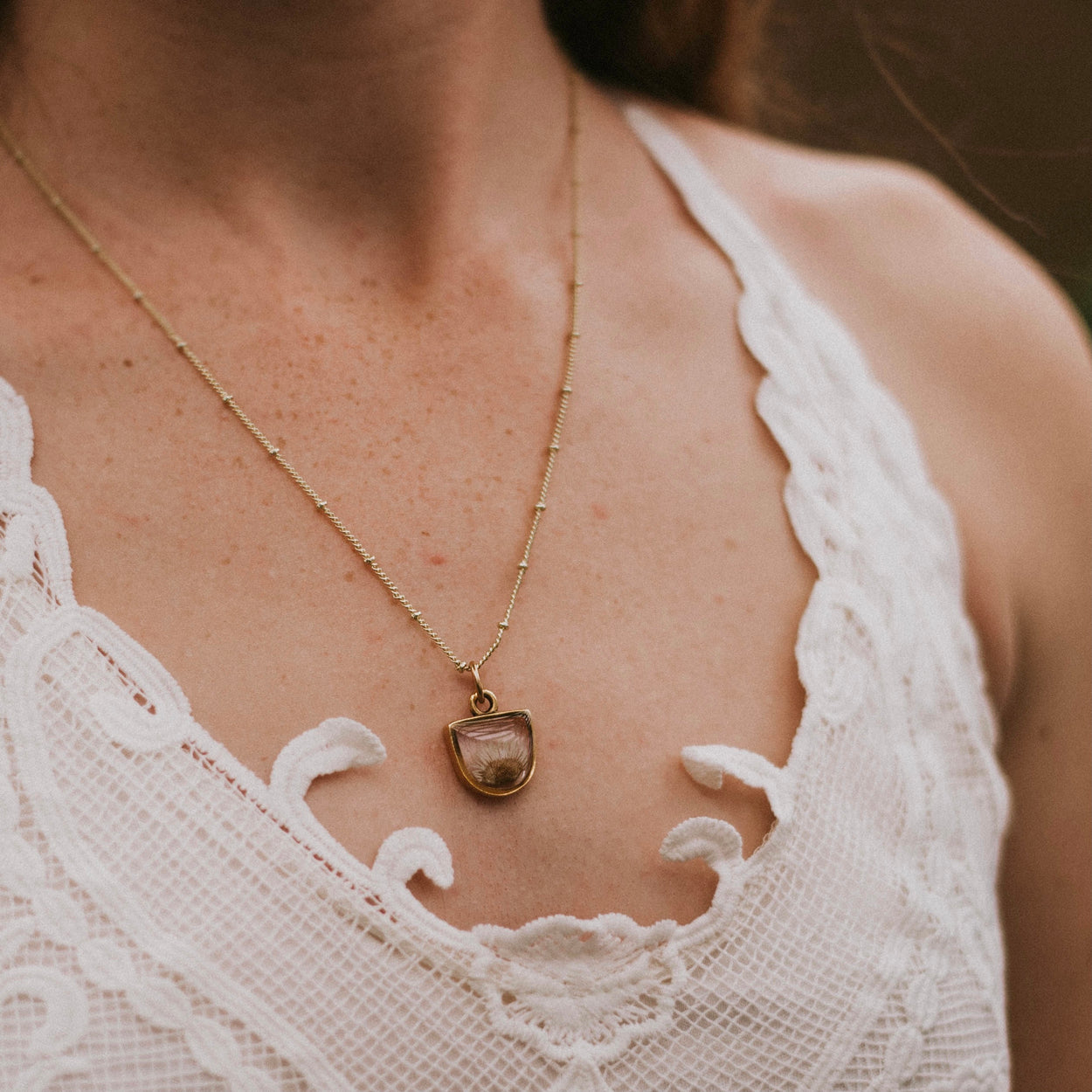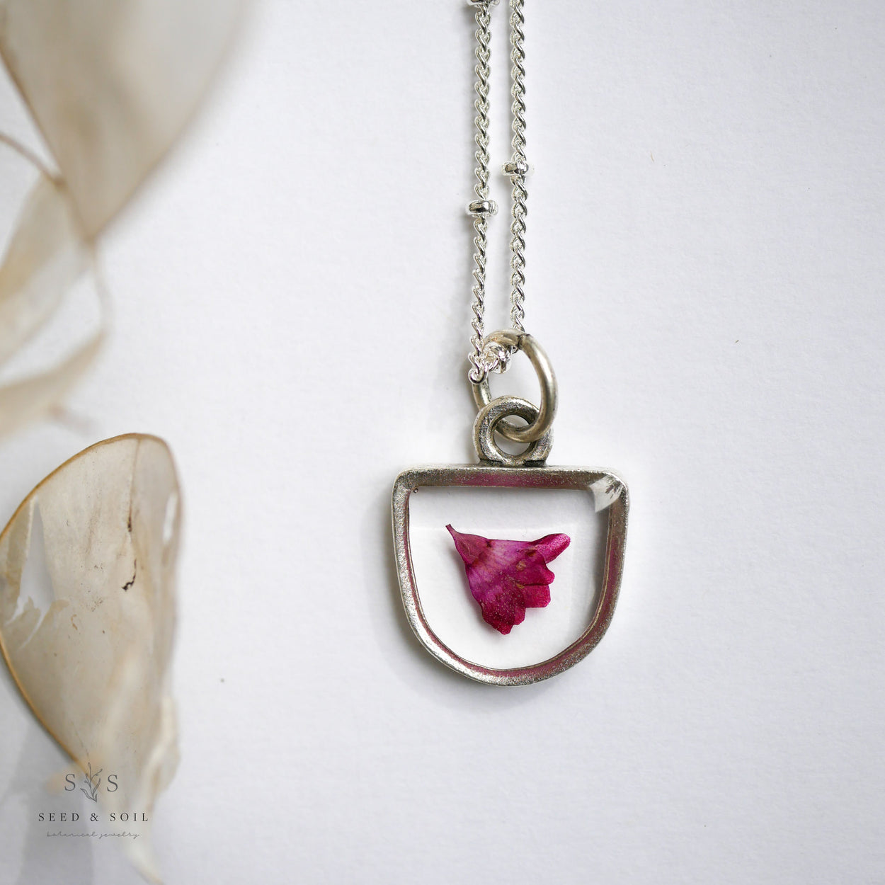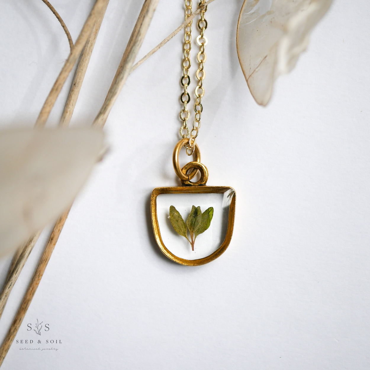 Chain is 20” long, gold or silver plated brass. Choose from a plain chain or a satellite chain. Ships in gift worthy packaging. The symbolism of the botanical is printed on a tag included with your jewelry.