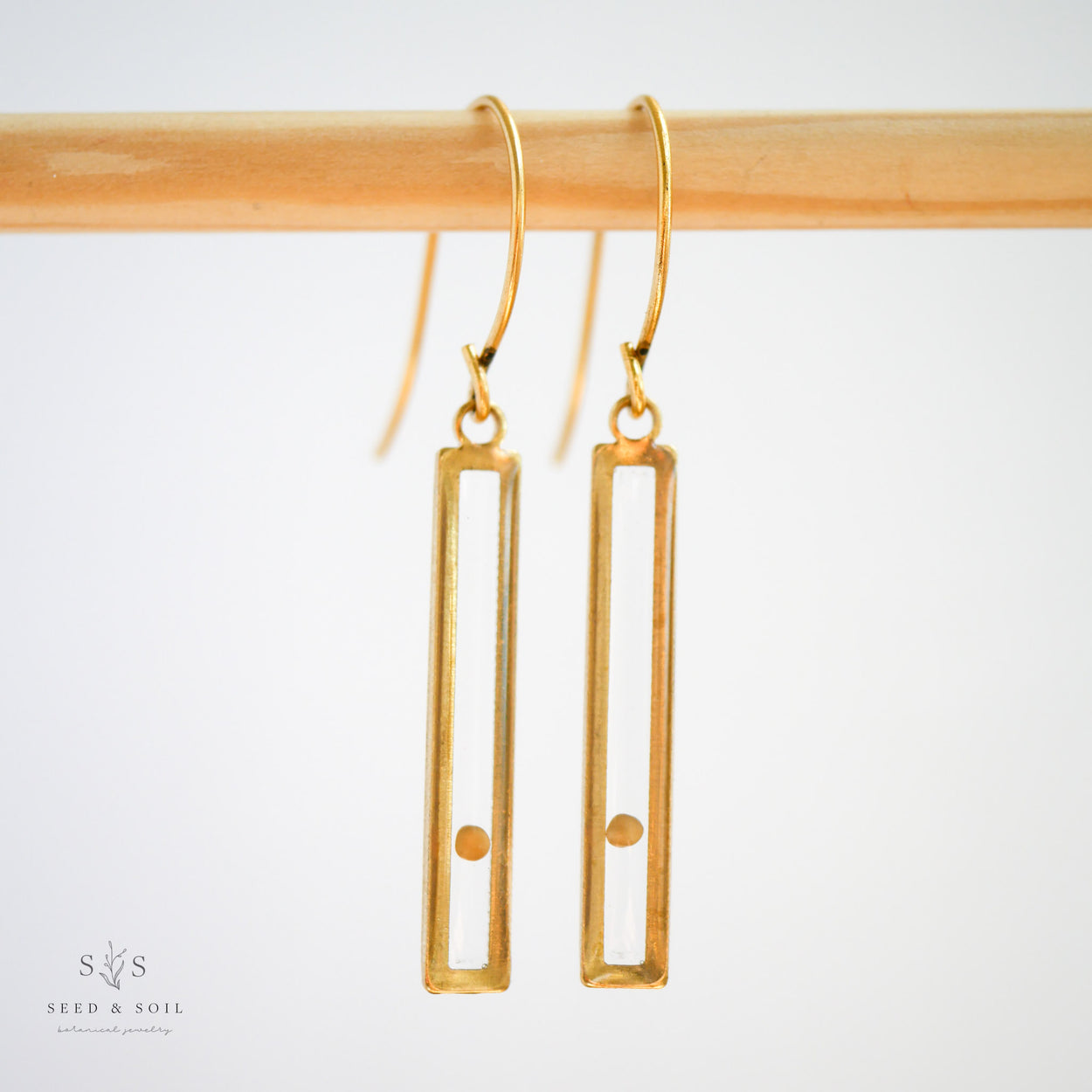 These handmade earrings contain one tiny mustard seed in each brass slim rectangle frame. A perfect gift to encourage and strengthen one to faith.
