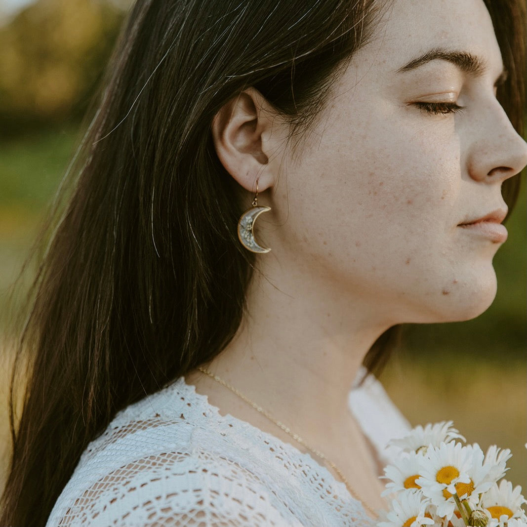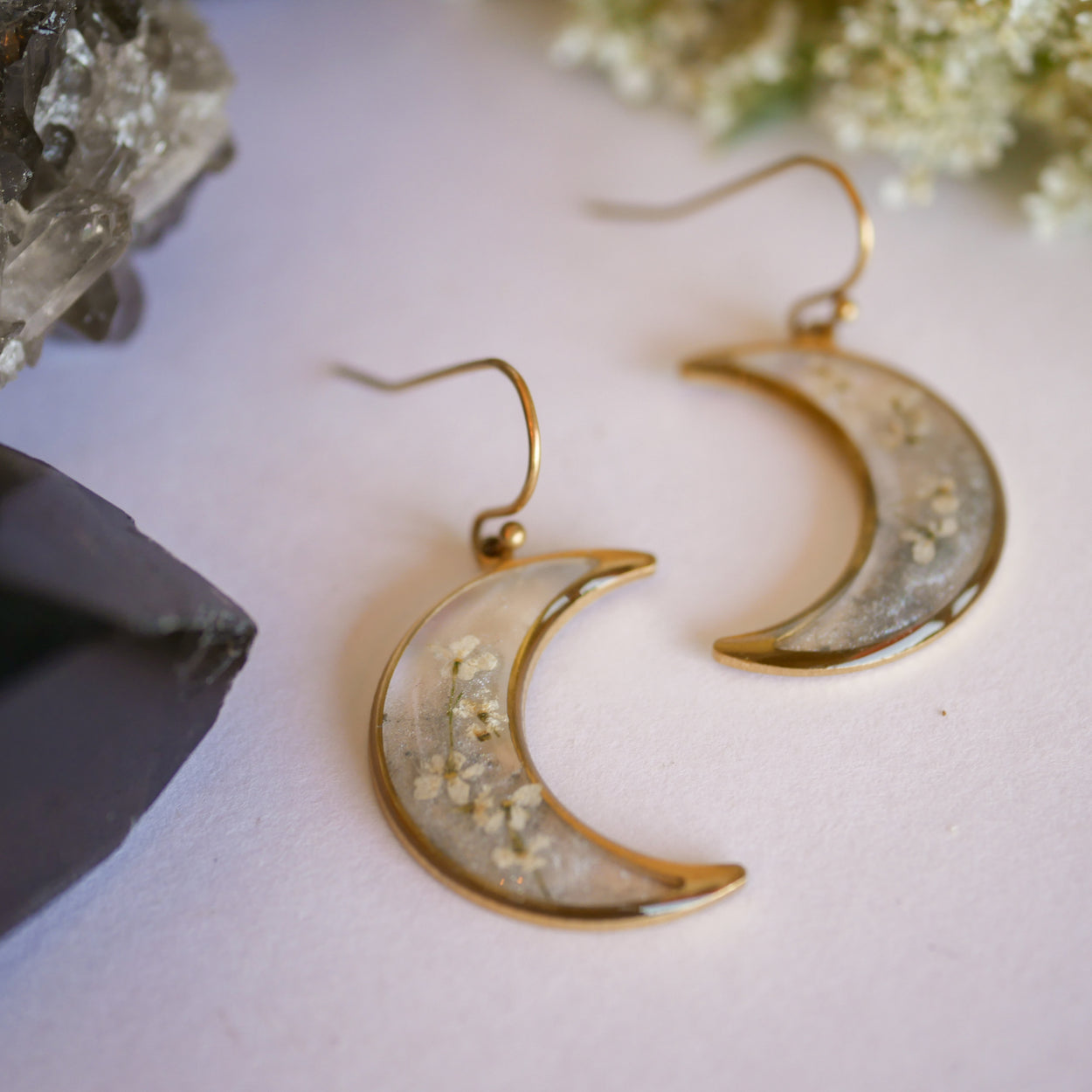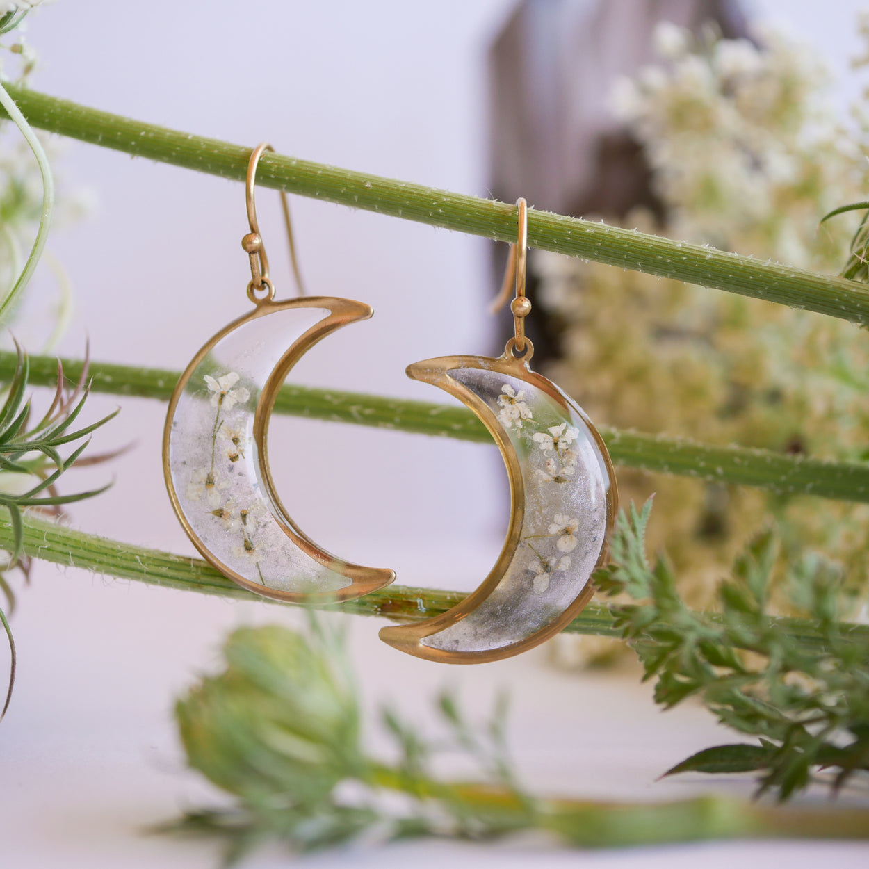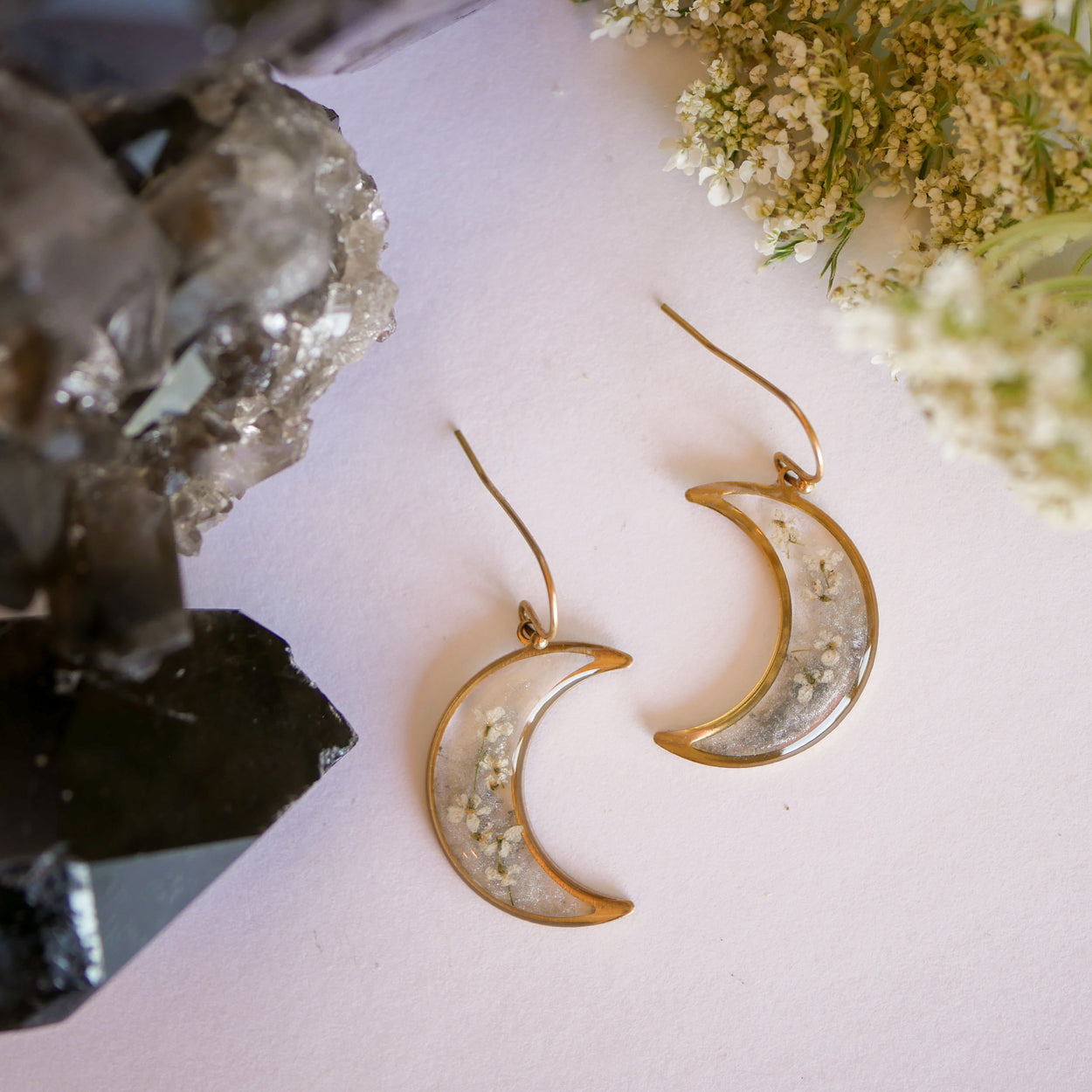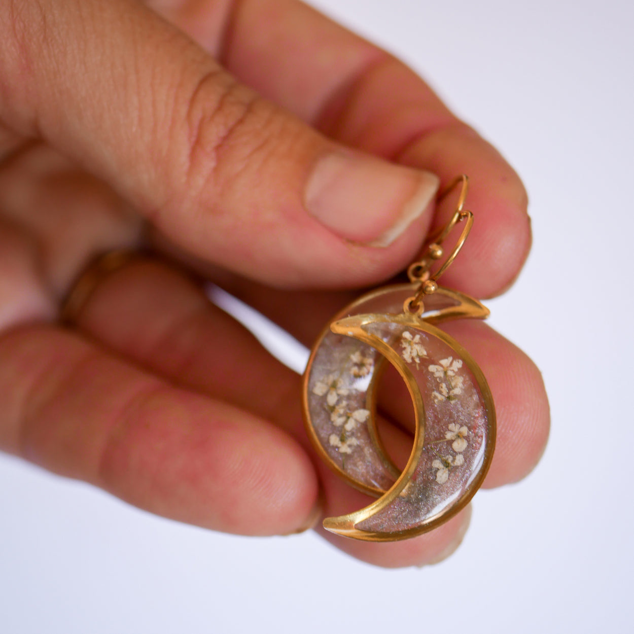 Our Moon Flower earrings are made from brass crescent moons and contain Queen Annes Lace Flowers placed against a shimmery silver background like stars in the night sky.