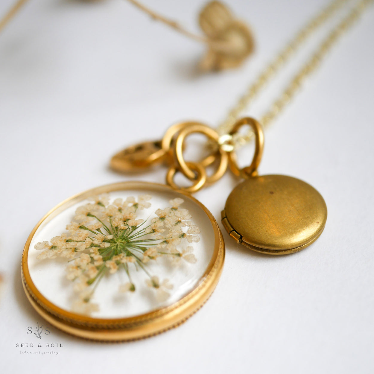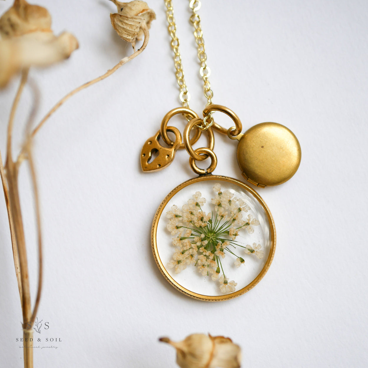 A small collection of whimsical pendants that beckon to times past; a tiny functioning brass locket, real Queen Anne’s Lace (I cant tell you how many customers have shared their sweet summer memories associated with Queen Anne’s Lace - it’s perhaps the most nostalgic botanical) preserved inside of our brand new embellished 24k gold plated round pendant, and a tiny heart shaped lock.