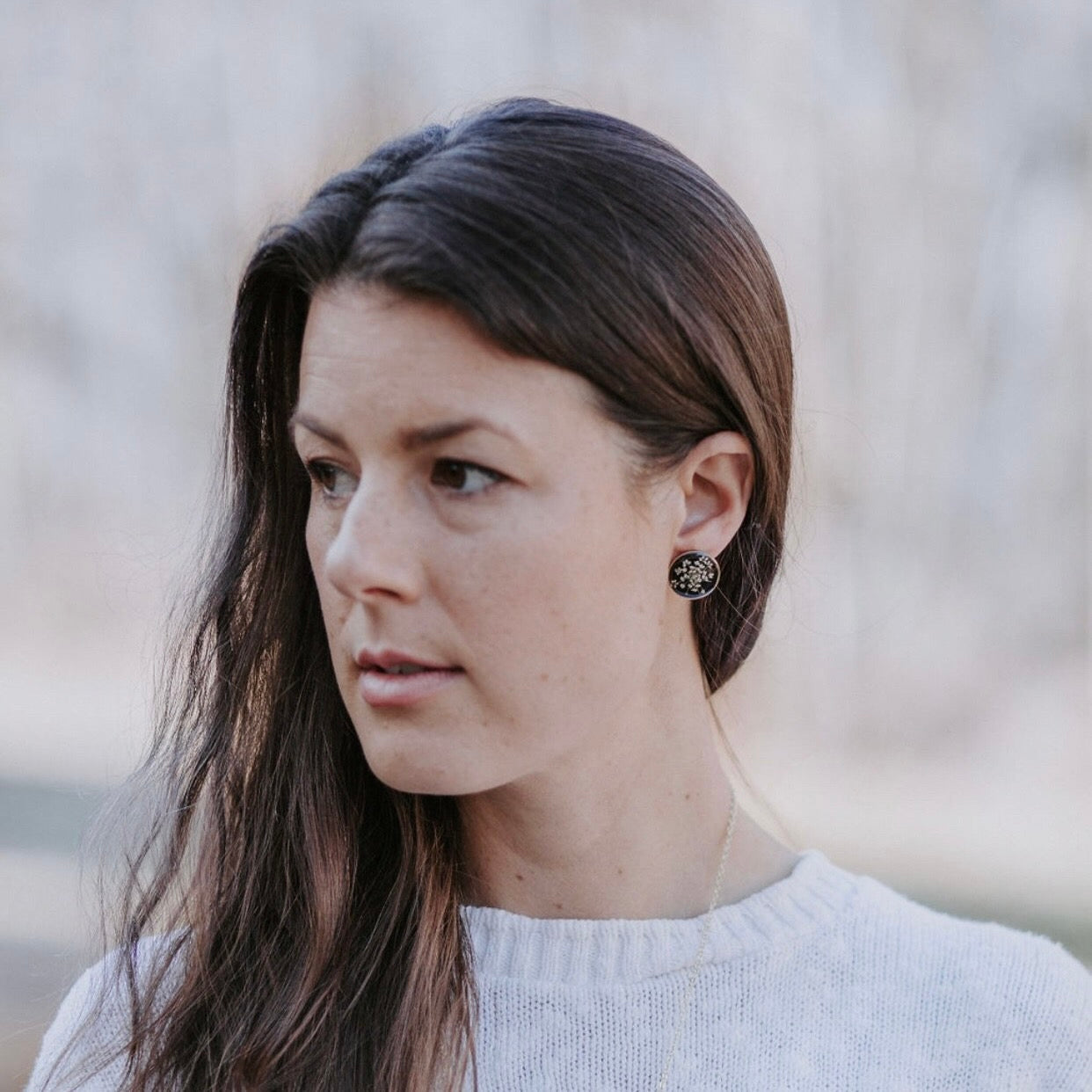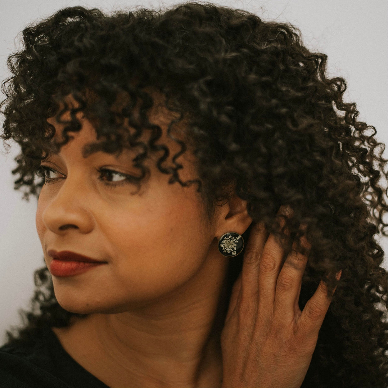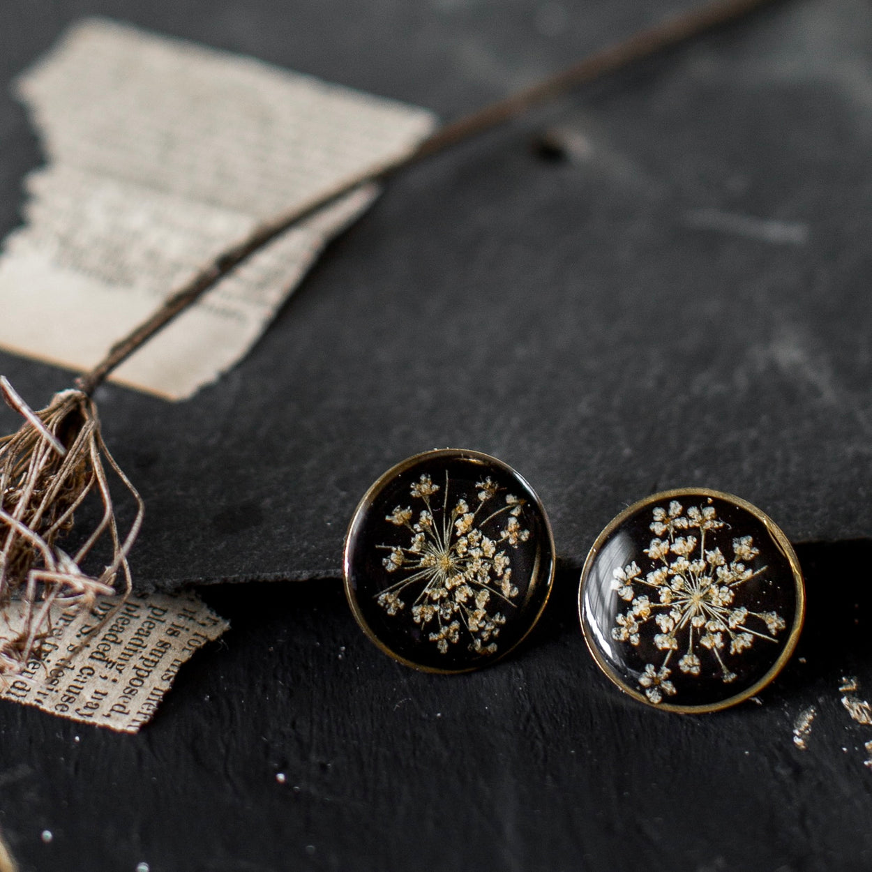 These round studs are made with brass frames and features a contrasting black background. The real preserved Queen Anne’s Lace flowers are sealed with a clear top coat. This style is reminiscent of the vintage cameo pendants while also giving a modern and chic feel.