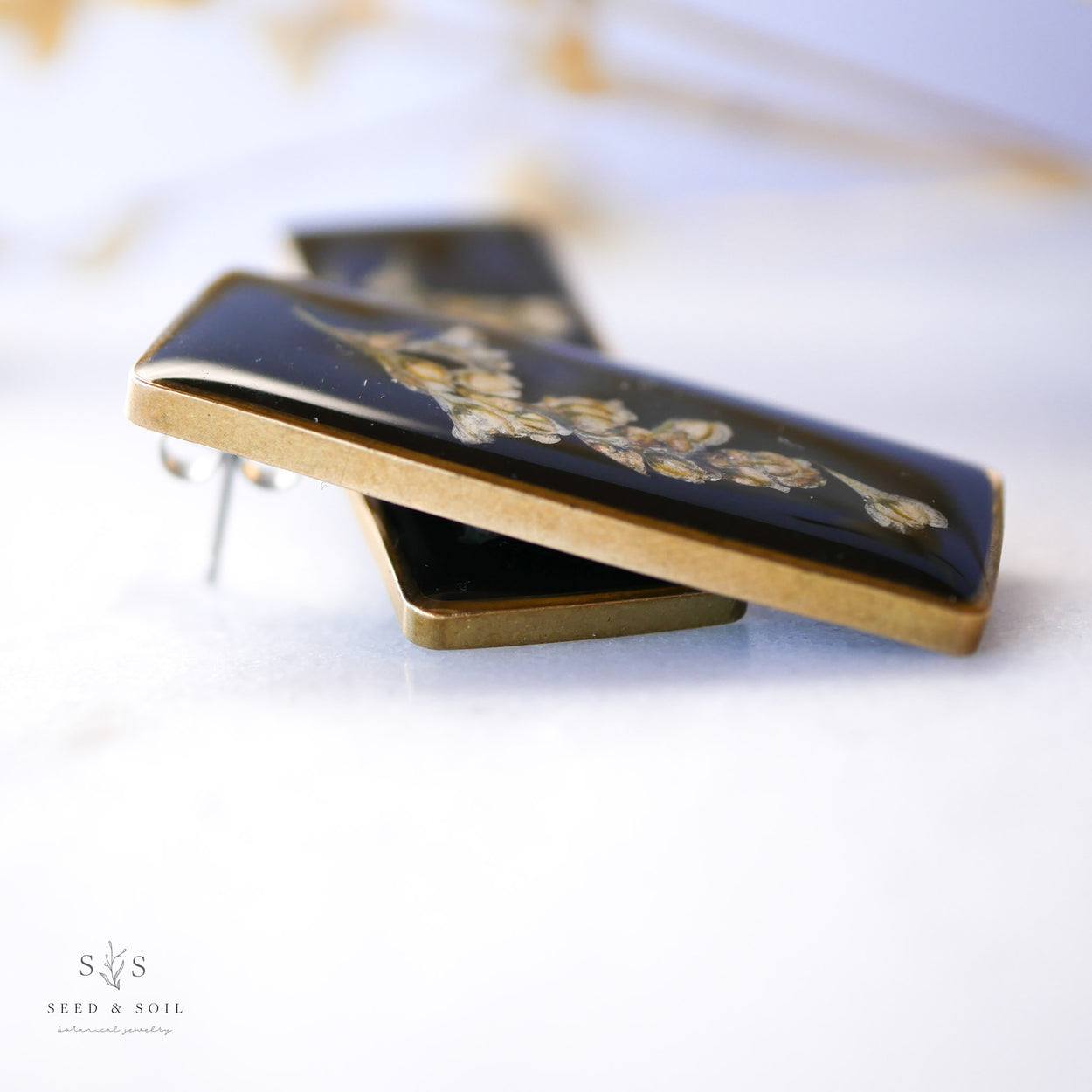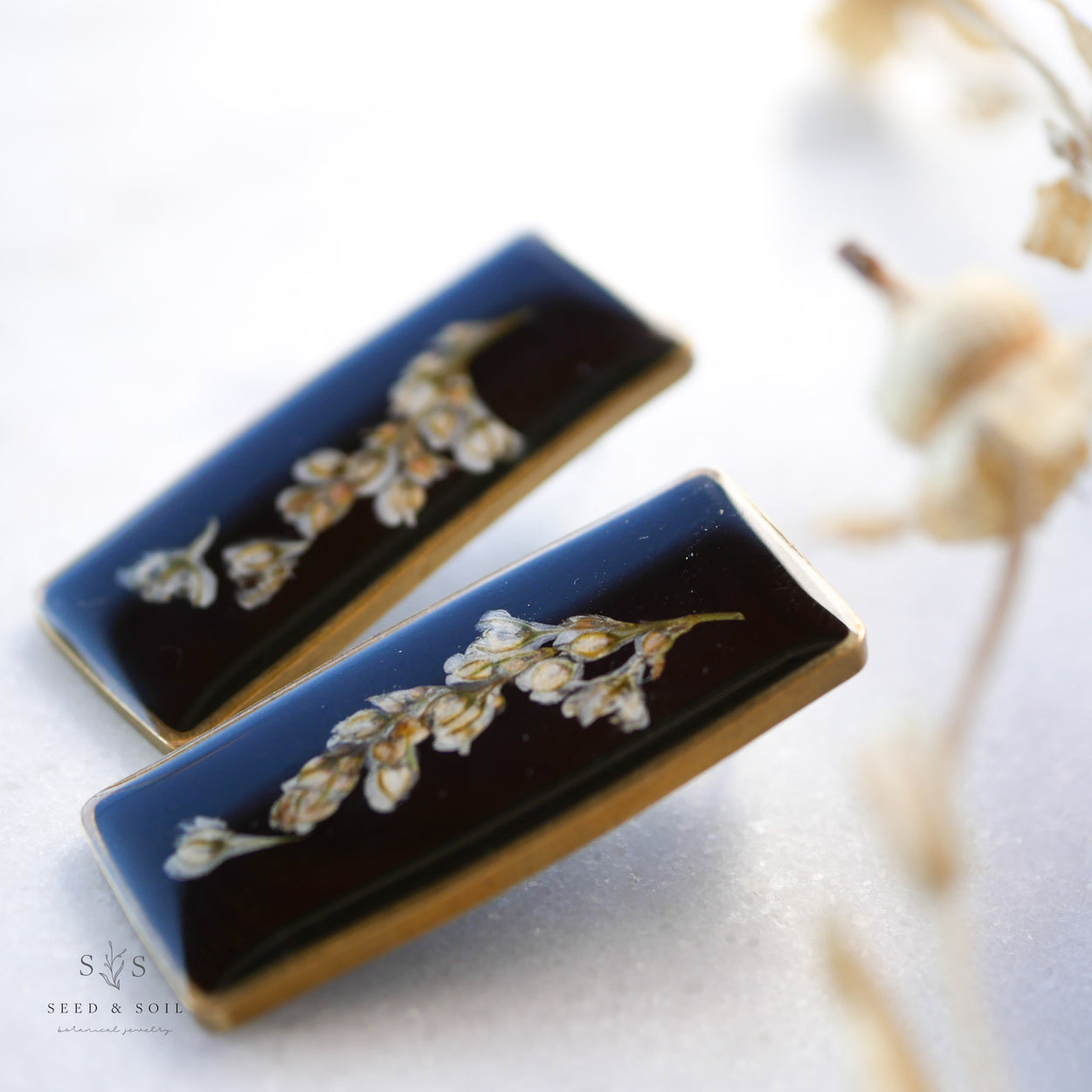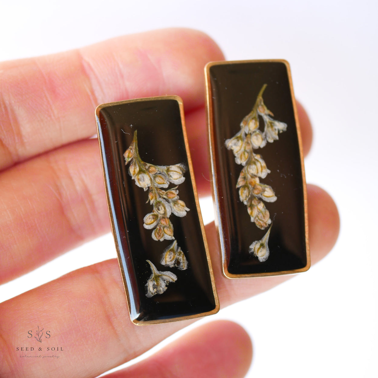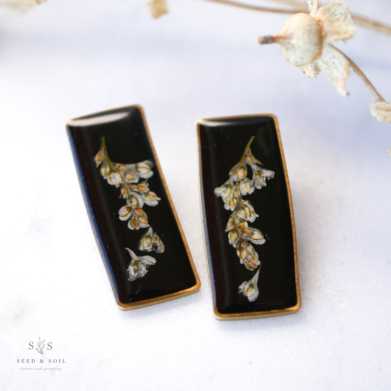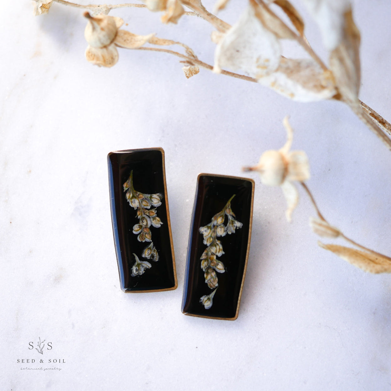 Tiny flowering Silver Lace Vines are preserved against a black background within a brass rectangle frame. Finished with a surgical grade stainless steel stud. These earrings feel both modern and classic.