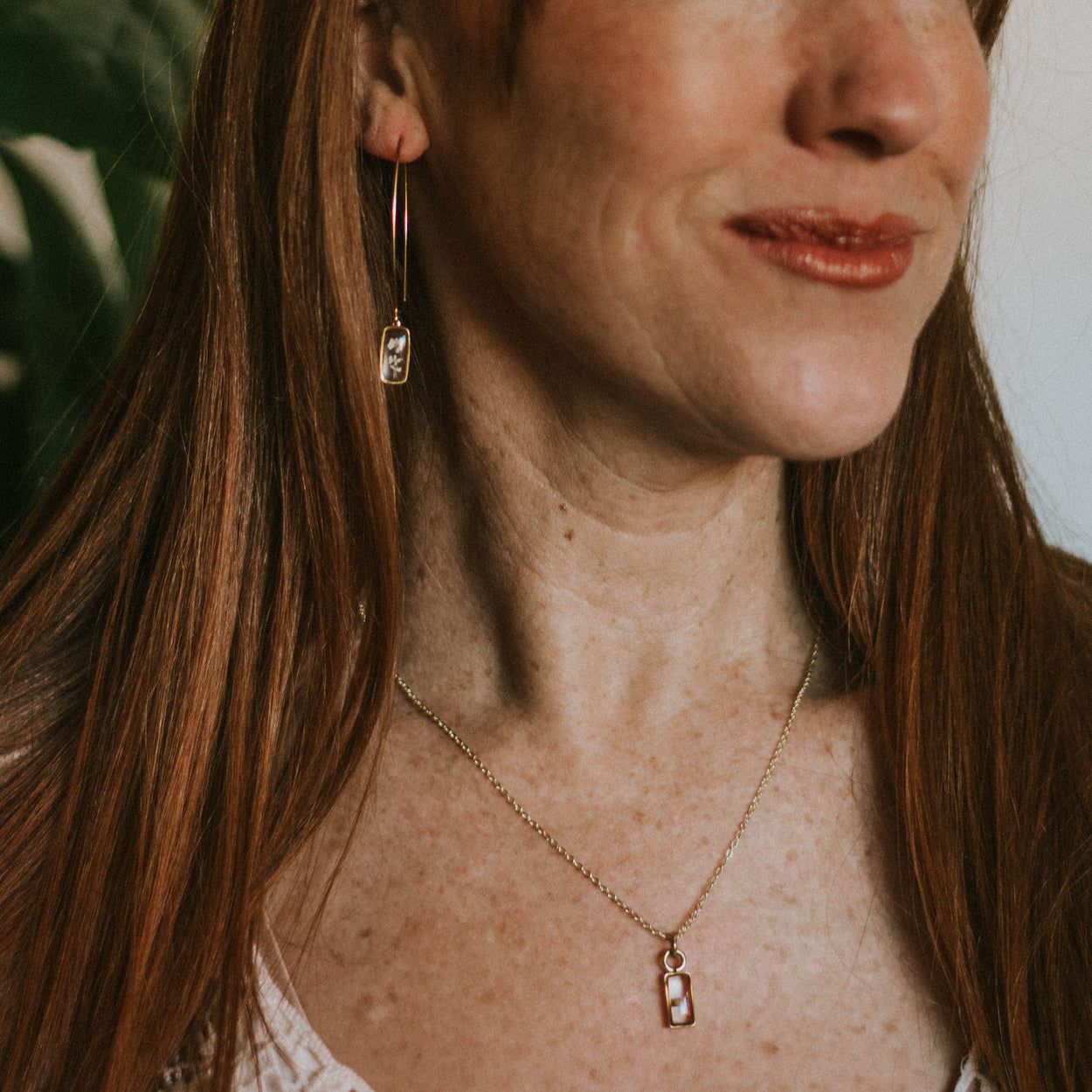 Chain is 18” long, gold or silver plated brass, choose from a plain chain or a satellite chain. Ships in gift worthy packaging. The symbolism of the botanical is printed on a tag included with your jewelry.