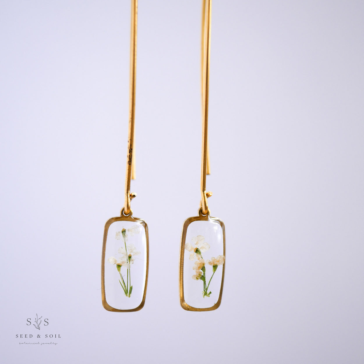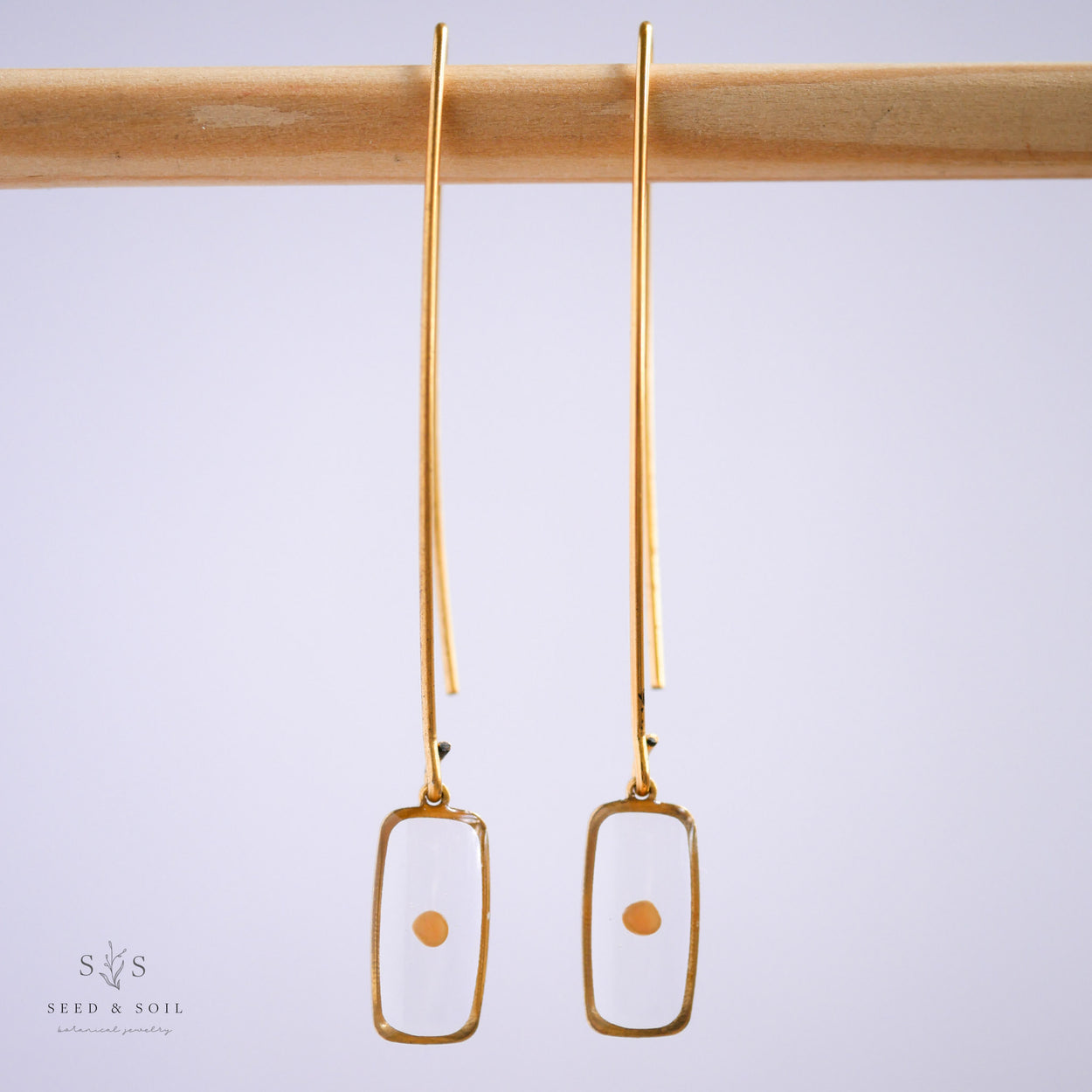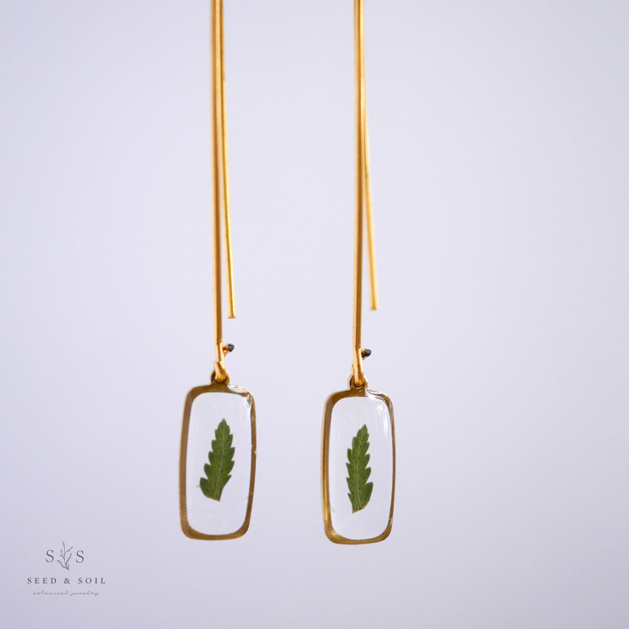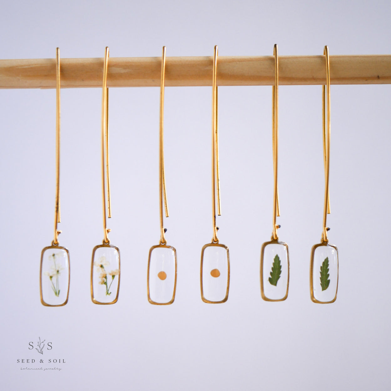 A delicate brass rounded rectangle frame dangles from the end of a 24k gold plated threader ear hook. Available in a variety of real preserved botanical.