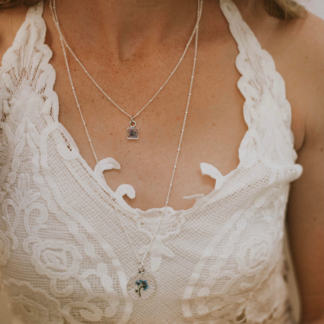 Our Tiny Square frame is a minimal and classic piece. Available with either a tiny real Fern, Coral Bell, or a single Forgetmenot flower.