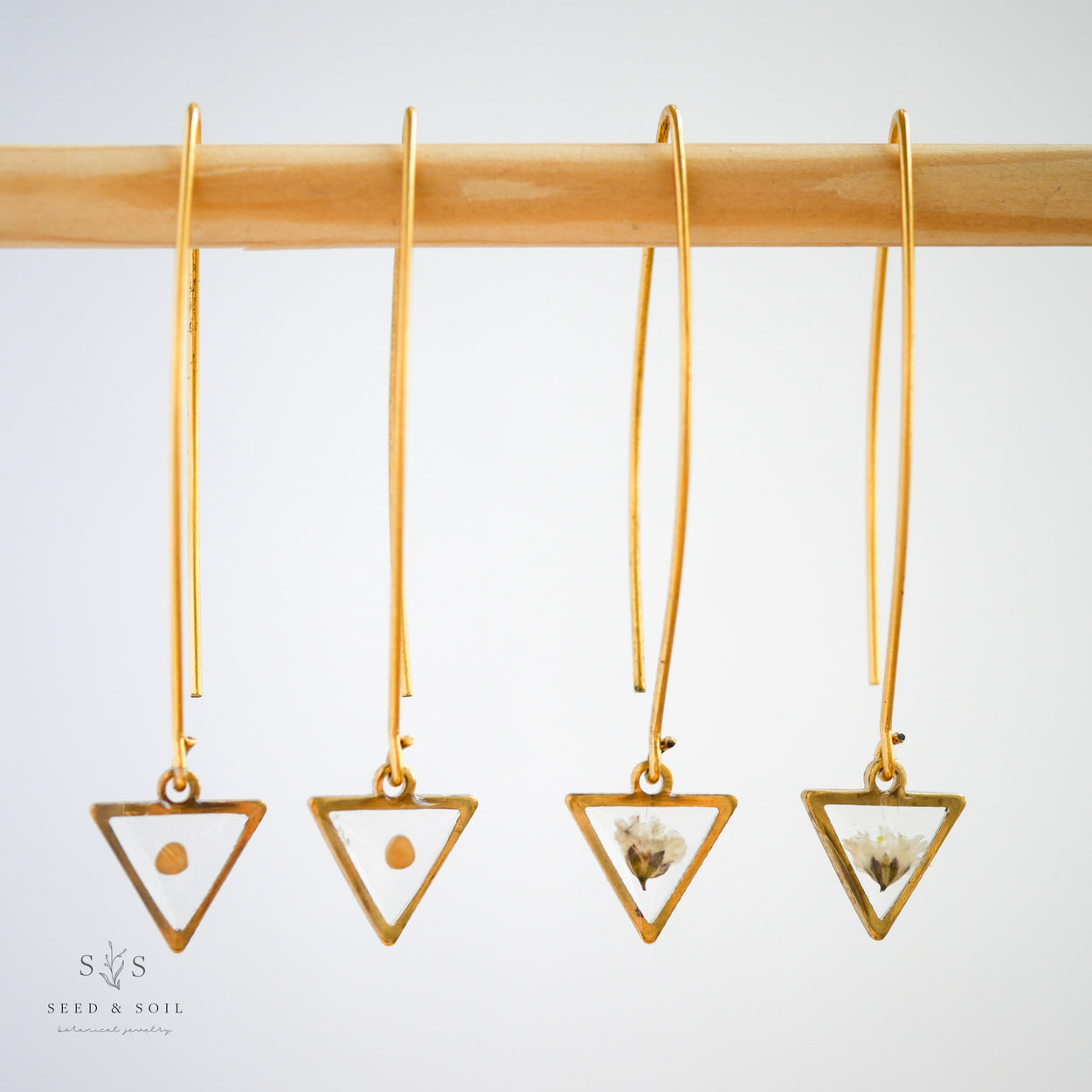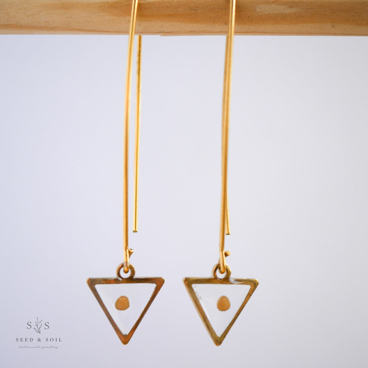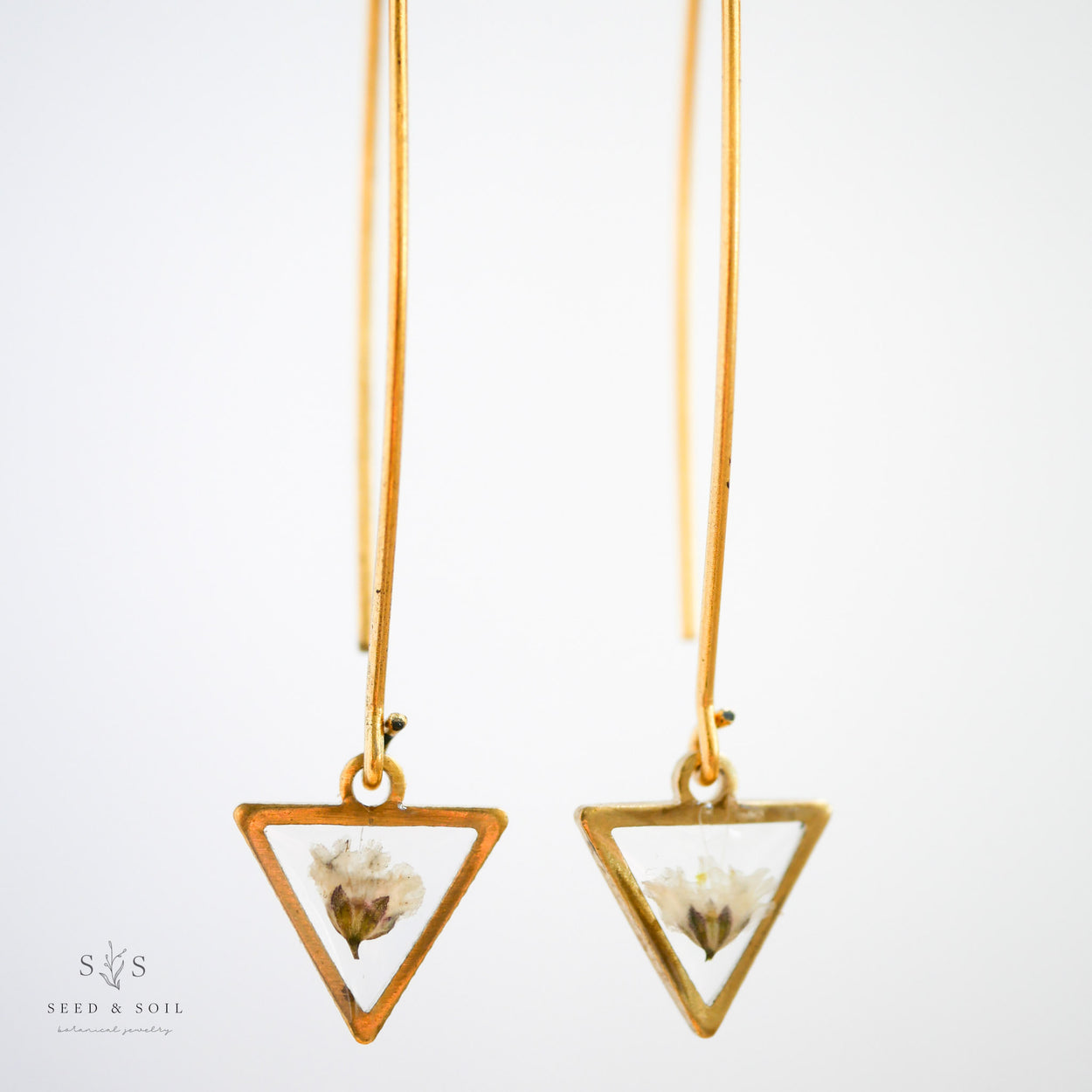 A delicate brass triangle frame dangles from the end of a 24k gold plated threader ear hook. Available in a variety of real preserved botanical.