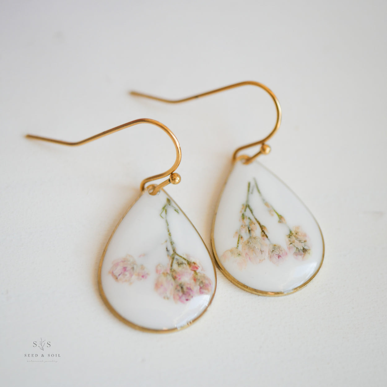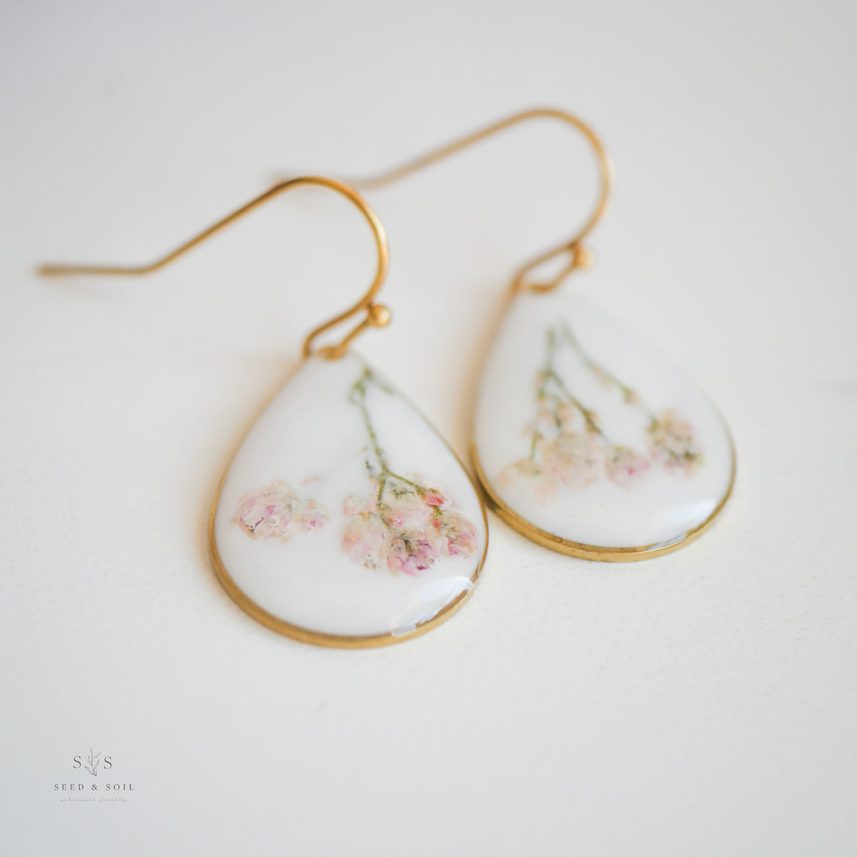 These small dangle earrings are delicate and lightweight, adorned with pink botanicals set against a white background.