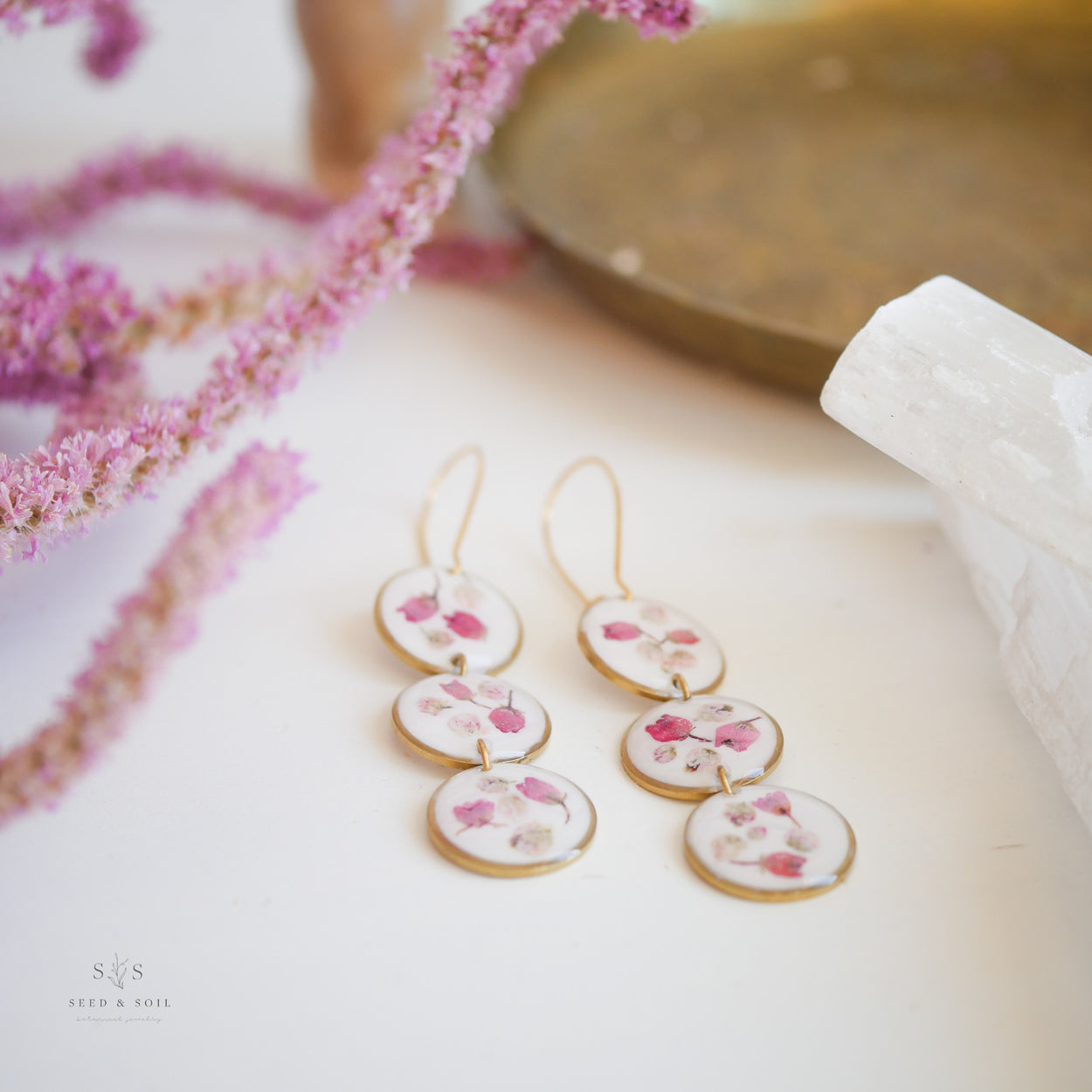 These dangle earrings are fun and unique, adorned with pink botanicals set against a white background.