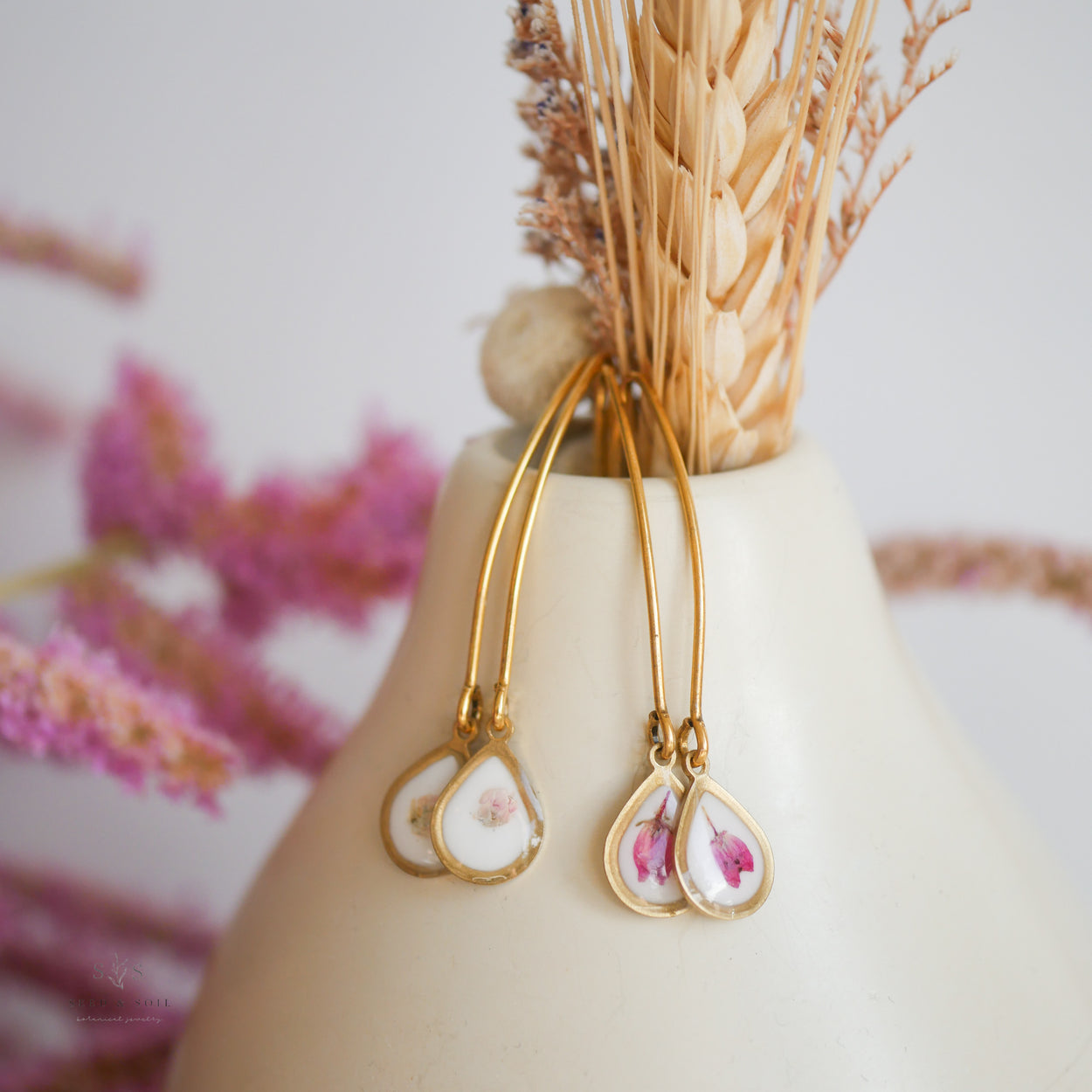These sweet petite threaders are easy to pair with any outfit, adorned with pink botanicals set against a white background.