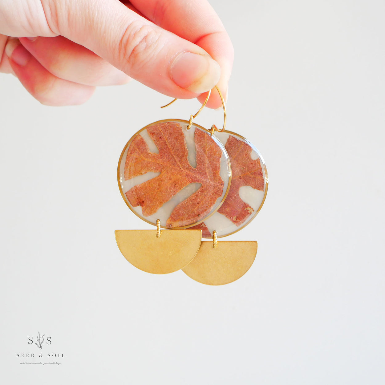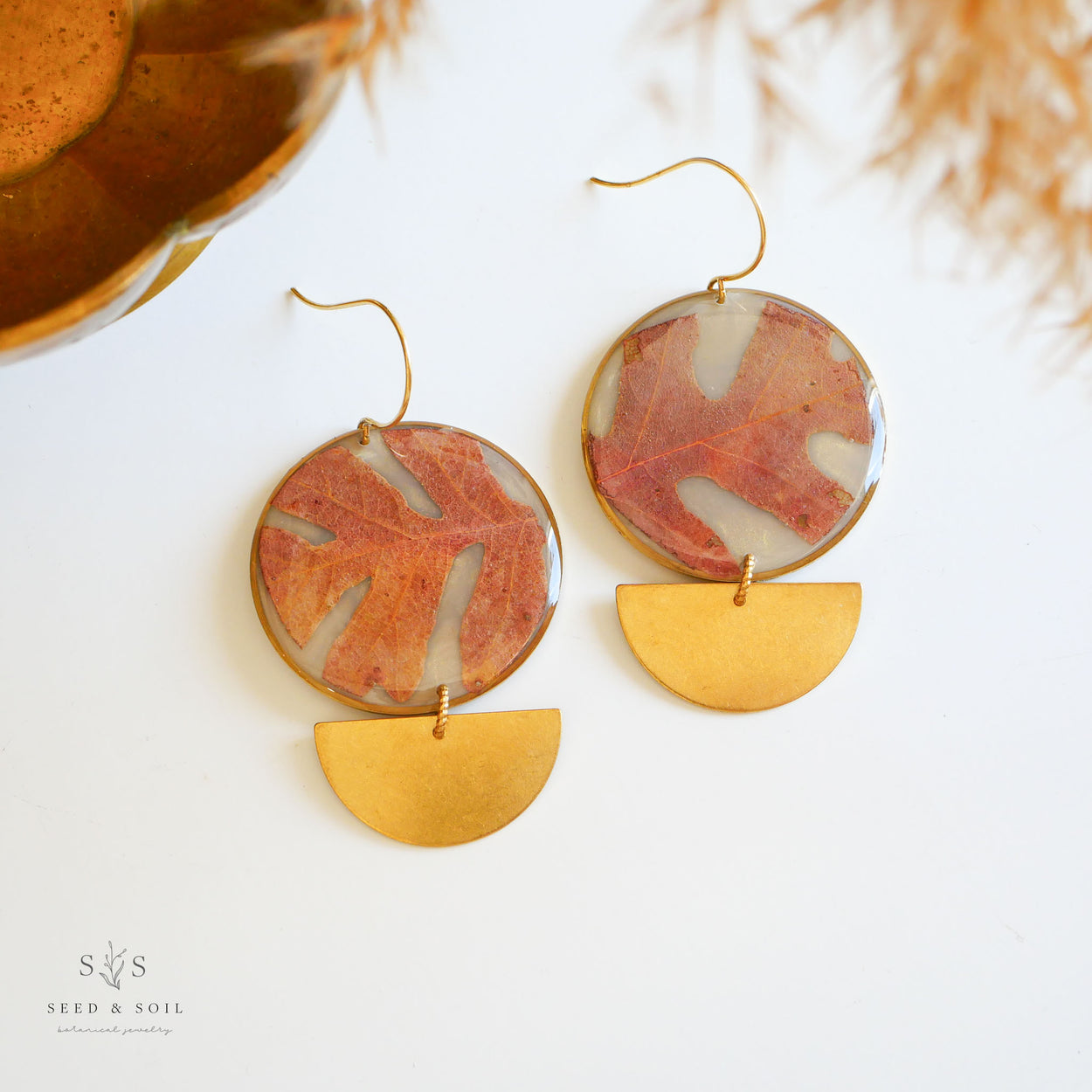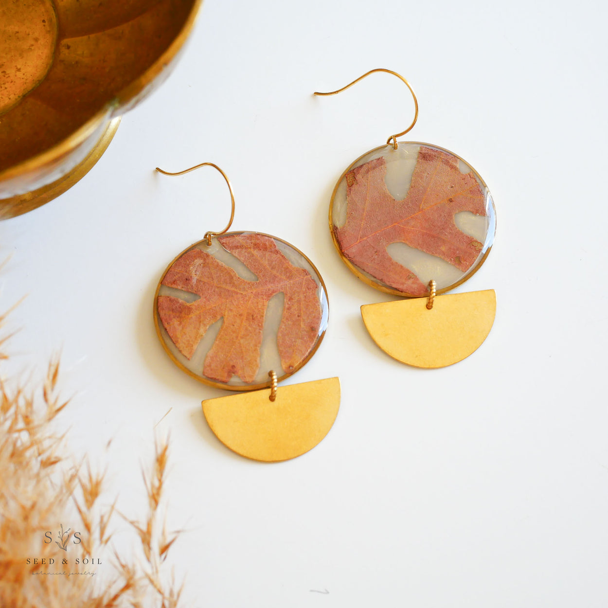 A carefully trimmed piece of real oak leaf is set against a shimmery metallic background inside these round brass frames. Accented with shimmery solid half moon shaped brass pieces. Wear it as a reminder from the Oak that strength often grows from the small choices and actions throughout each day.