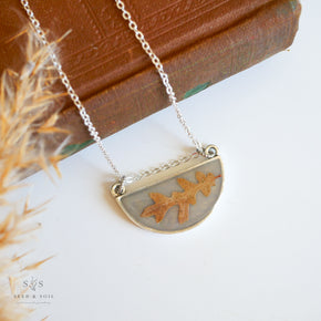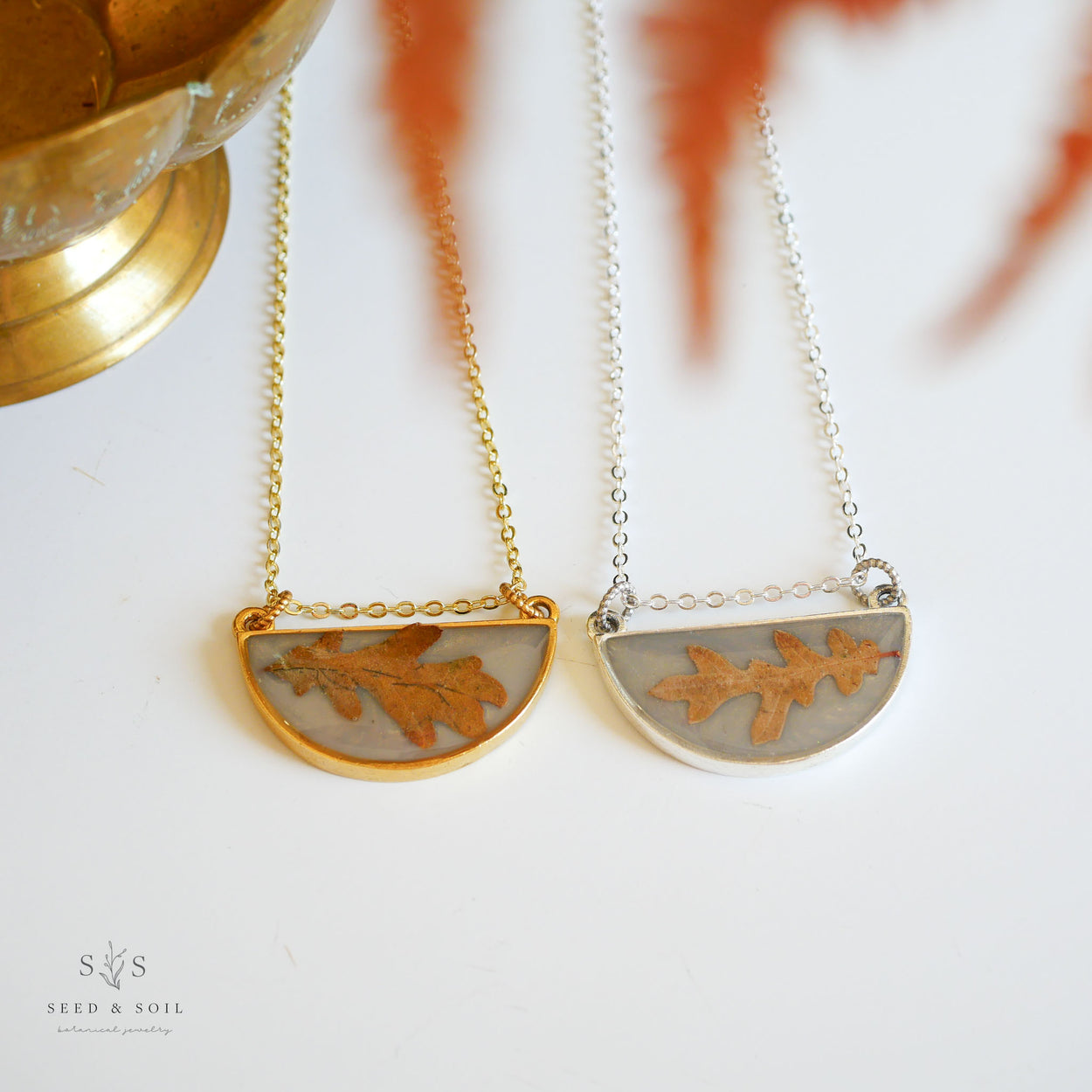 A single tiny oak leaf is set against a shimmery metallic background inside this cast metal pendant. Wear it as a reminder from the Oak that strength often grows from the small choices and actions throughout each day.