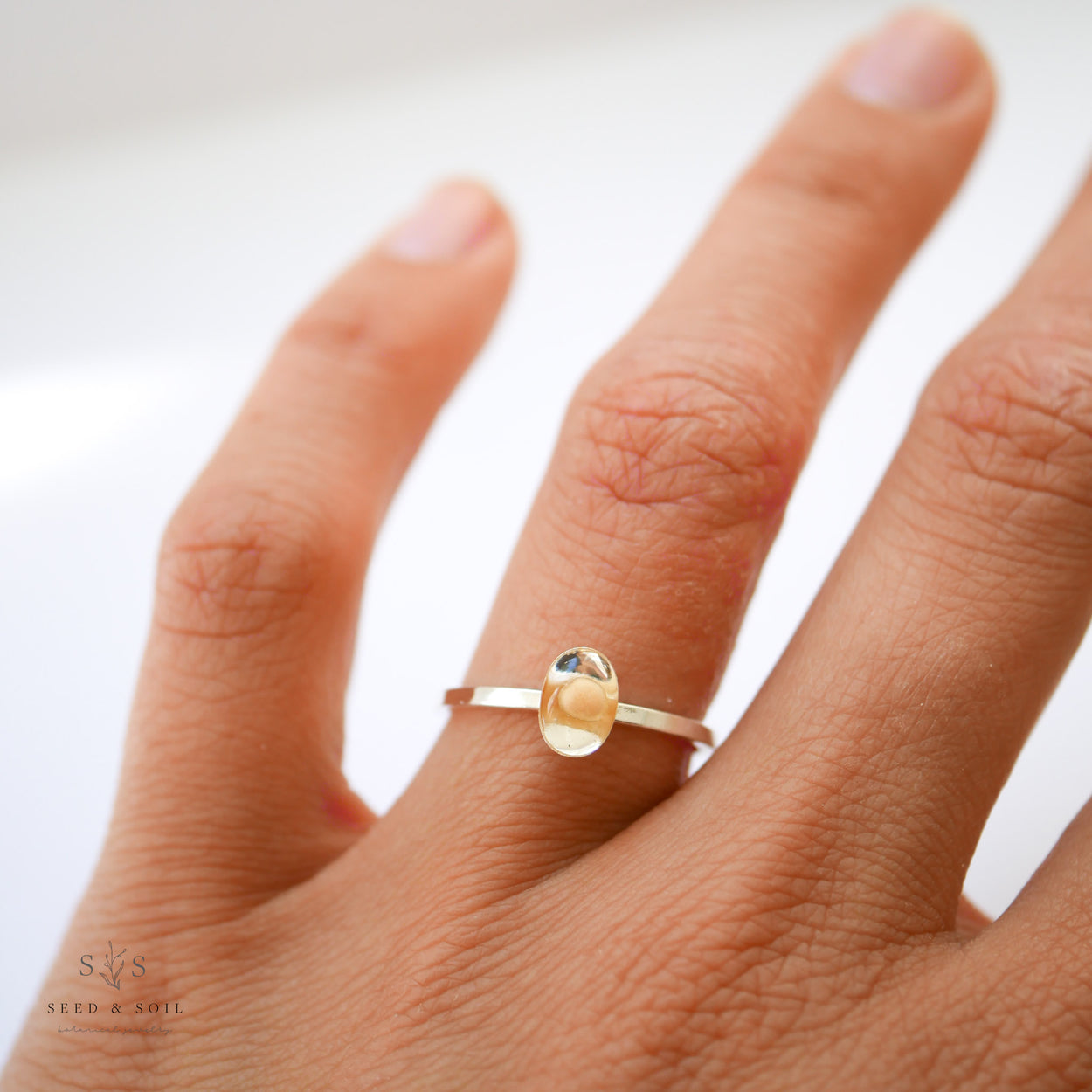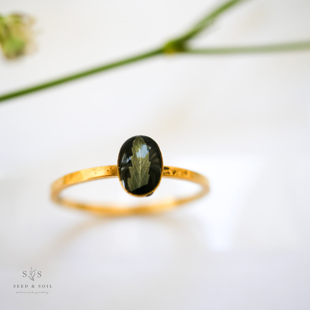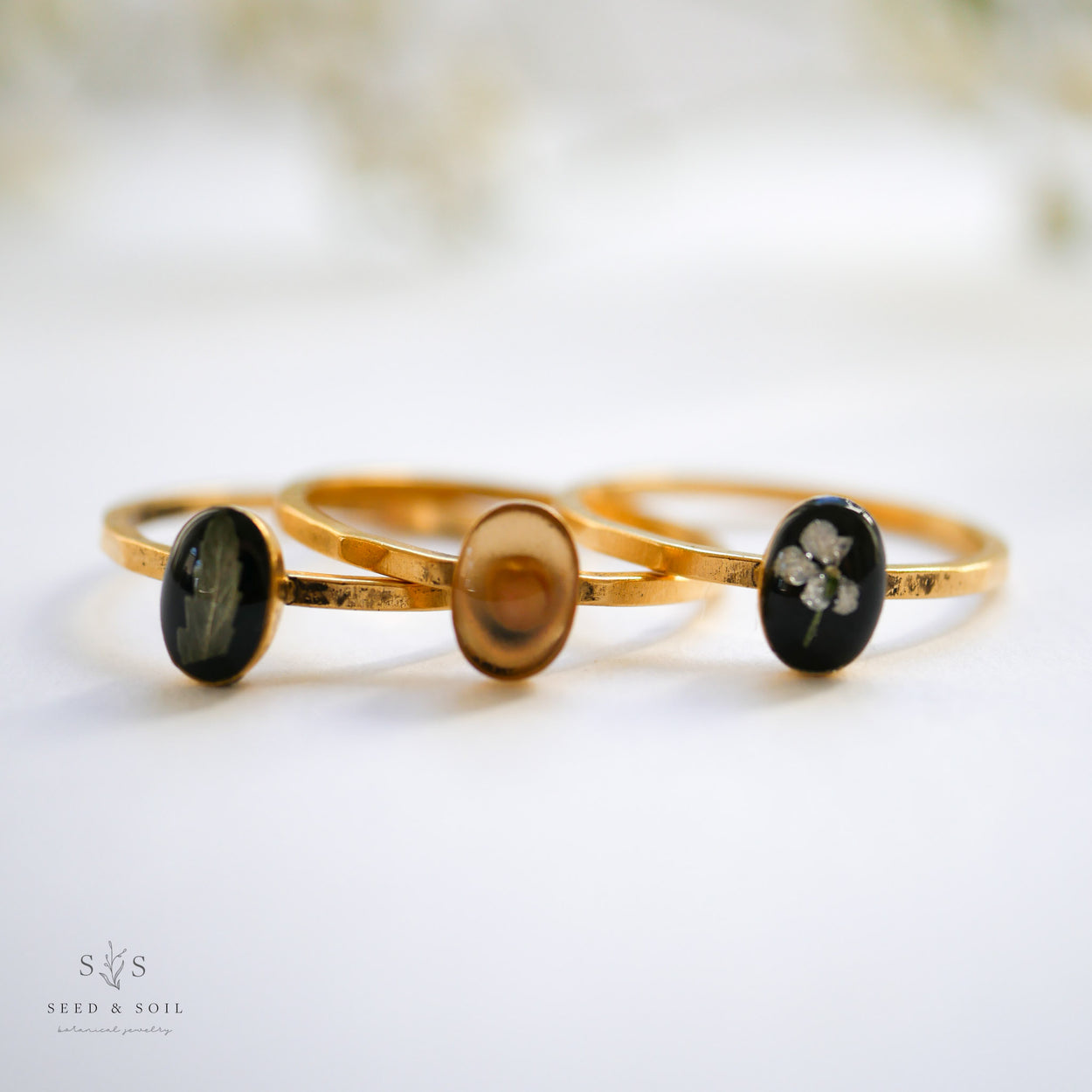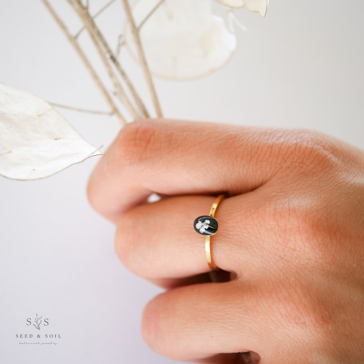 Our Slim Oval Stacking ring is beautiful whether you wear this delicate ring alone or choose to stack it up! Available with either a tiny Fern or Queen Anne’s Lace flower and black background or a single Mustard Seed and clear background.