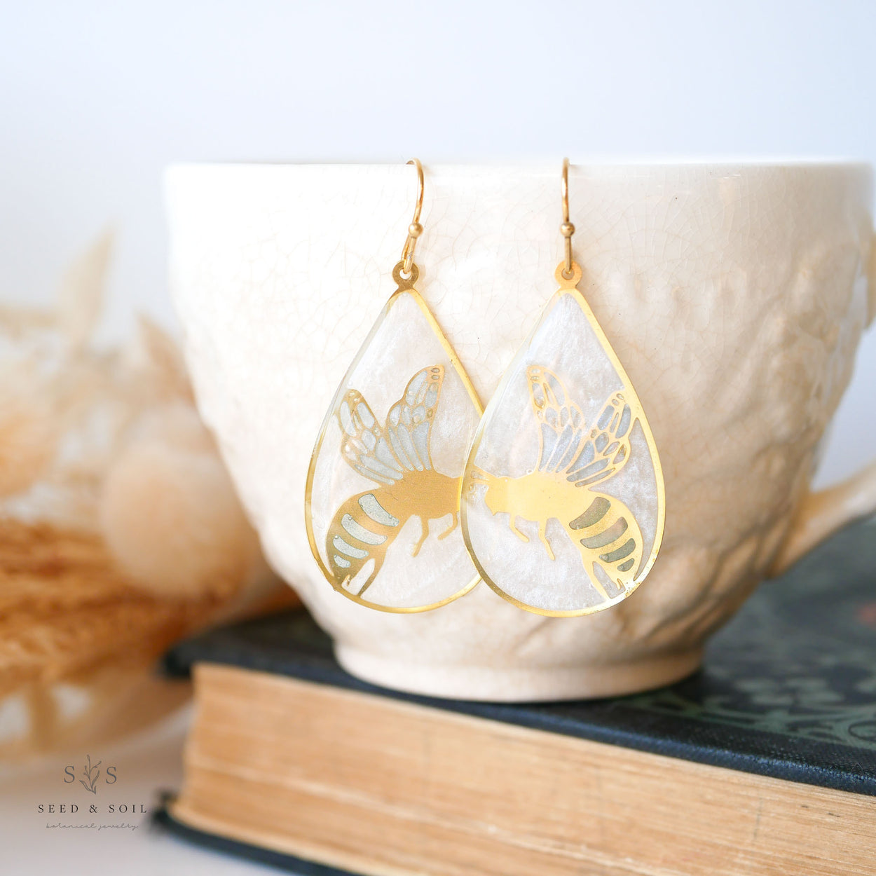 A solid brass frame ornately finished with a variety of carefully placed bits of colored resin - making this collection reminiscent of stained glass. Like wearing tiny pieces of art! Frame dangles from a gold plated hypoallergenic ear hook. Each is made by hand and one of a kind!