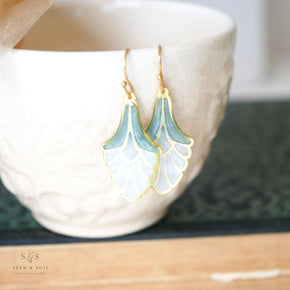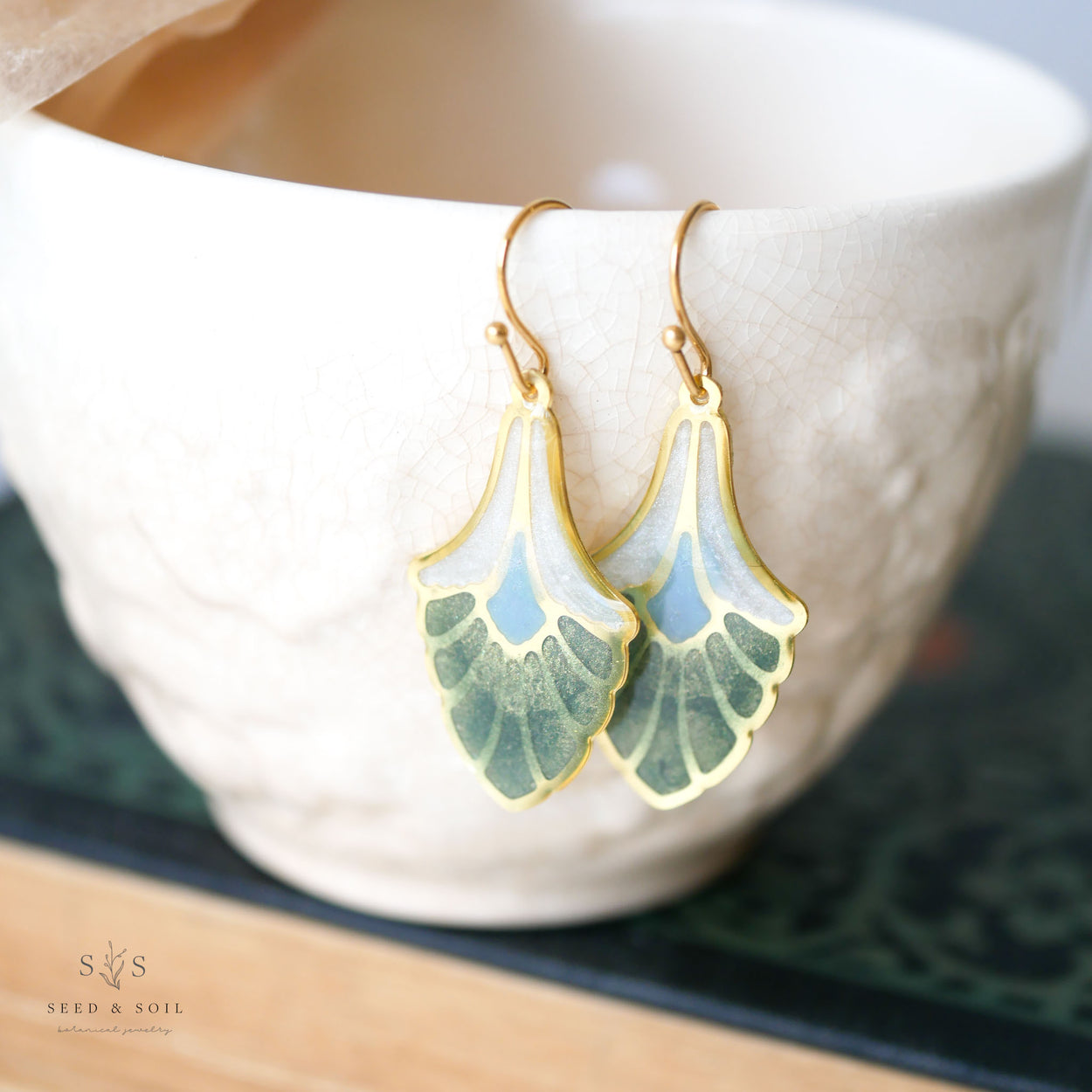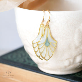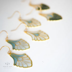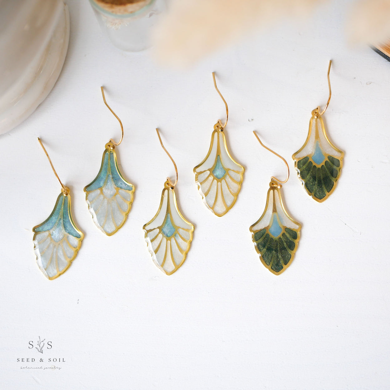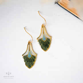A solid brass frame ornately finished with a variety of carefully placed bits of colored resin - making this collection reminiscent of stained glass. Like wearing tiny pieces of art! Frame dangles from a gold plated hypoallergenic ear hook. Each is made by hand and one of a kind!
