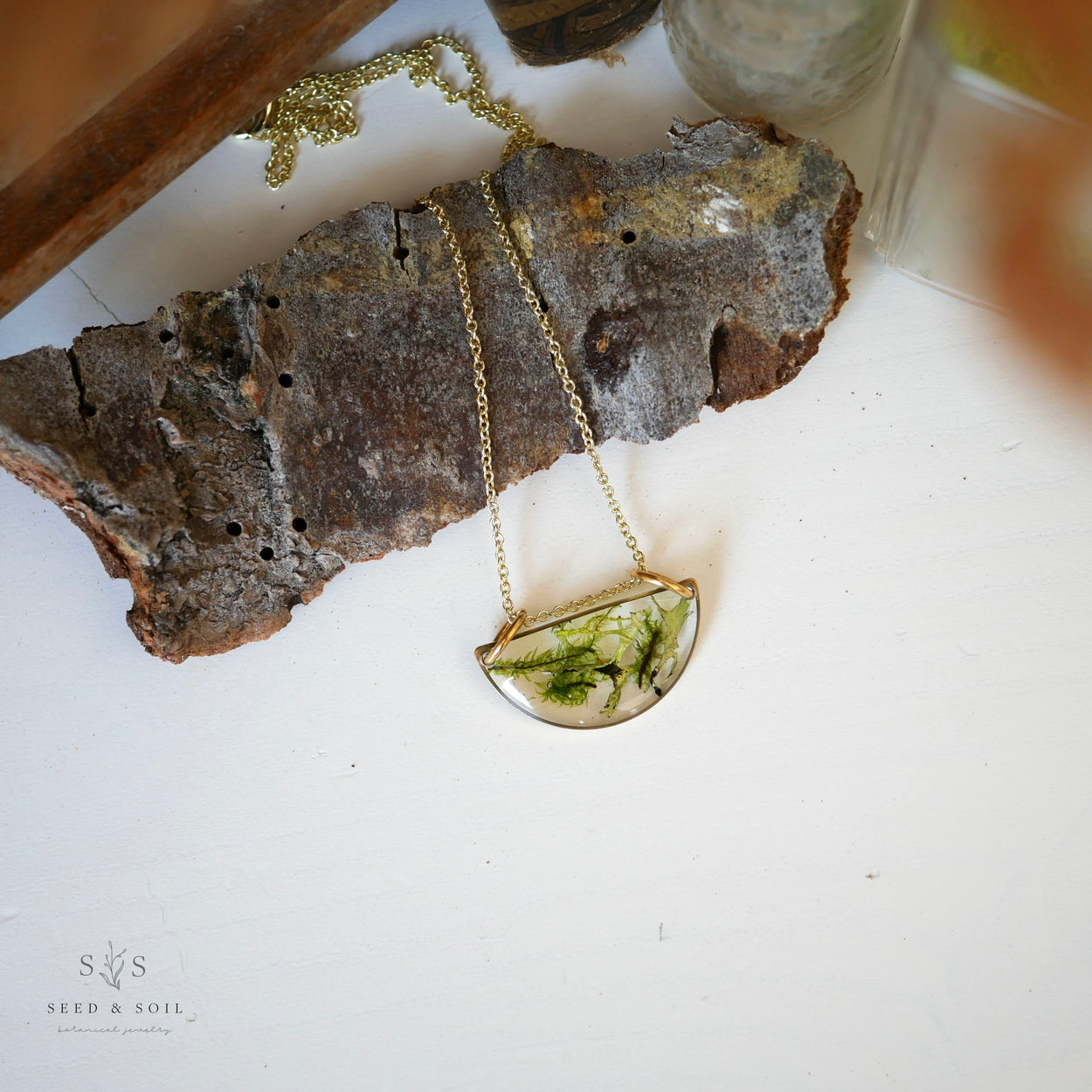 Our favorite Luna Necklace in our Woodland Collection finish. Featuring a variety of moss specimens for a beautiful layering of colors and textures.