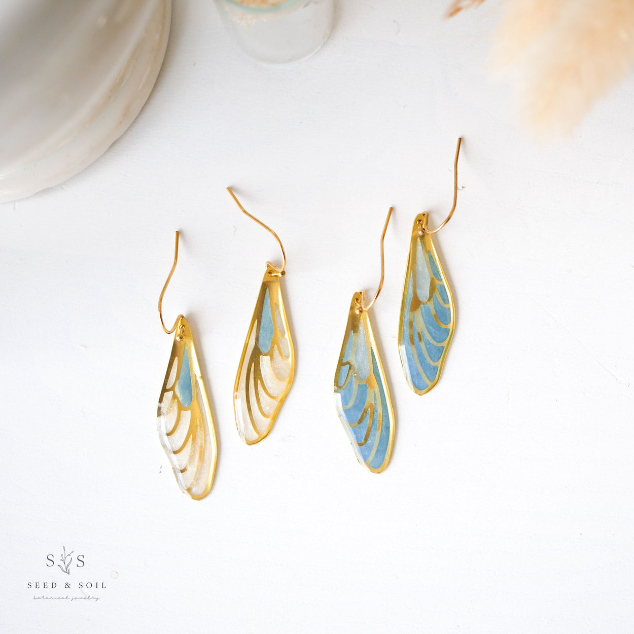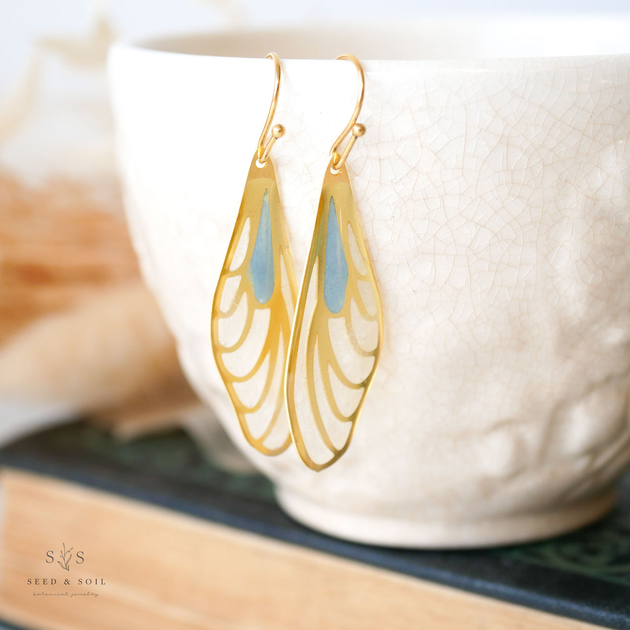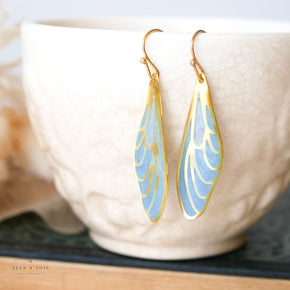 A solid brass frame ornately finished with a variety of carefully placed bits of colored resin - making this collection reminiscent of stained glass. Like wearing tiny pieces of art! Frame dangles from a gold plated hypoallergenic ear hook. Each is made by hand and one of a kind!